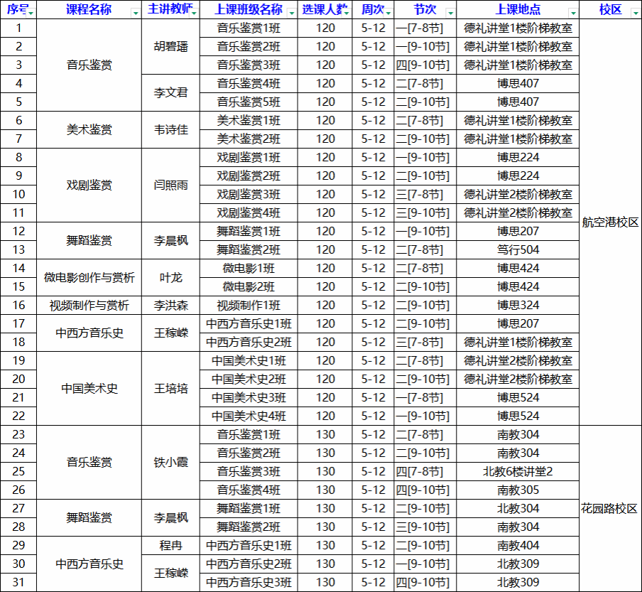 二、课程开设:本学期开设公共艺术线下课程共计8门:《影视音乐鉴赏》、《音乐鉴赏》、《美术鉴赏》、《戏剧鉴赏》、《舞蹈鉴赏》、《中西方音乐史》、《视频制作与赏析》和《中国美术史》,开设31个教学班(花园路校区9个,航空港校区22个),各教学班人数上限为120-130人。